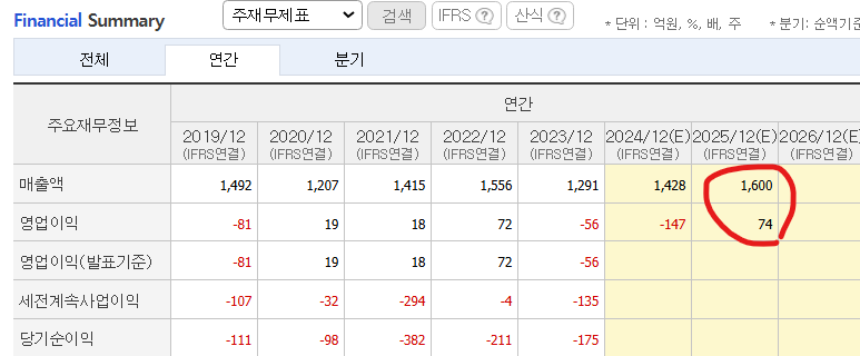 연간 매출액 약 1400억원대를 유지하고 있으나 2년간 영업이익 적자로 주가는 바닥권이나 올해 연간 예상 매출액은 1600억원 영업이익은 74억 원으로 흑자를 예상하고 있습니다.