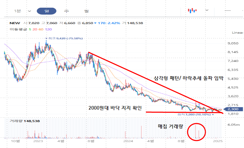 23년 8월, 8천 원대 고점을 찍은 이후 1년 반 이상 하락 후 최근 2000원 기준 바닥 지지를 만들었고 금일 20일선, 60일선을