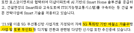 포스코DX는 ICT융합기술, 지능형 시스템, 로보틱스, 자동화 솔류션 등의 디지털전환 사업을 주력하고 있음을 알 수 있습니다. 특히, 로봇 및 자율주행의 신사업을 주목해야 하며 향후 실적 성장성이 기대되는 종목입니다.