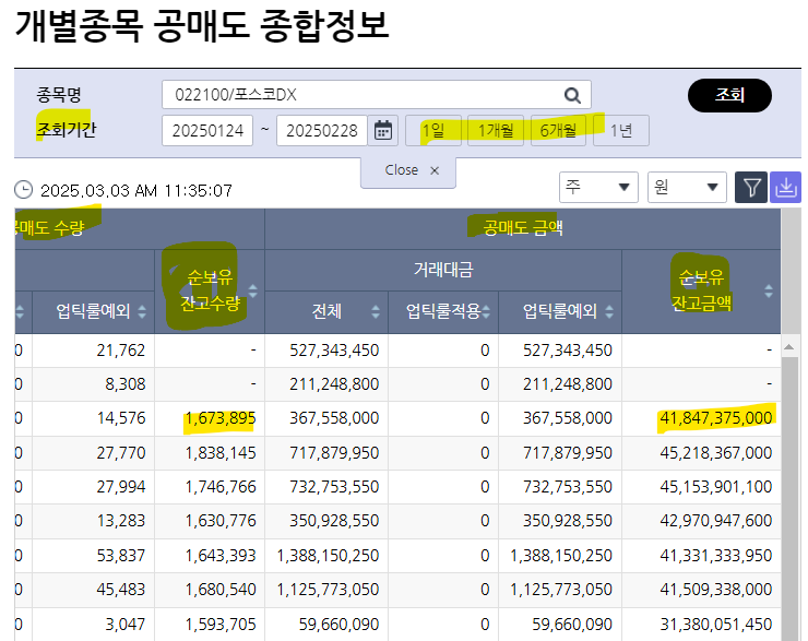 조회기간은 1/24~2/28일 한 달 동안의 현황입니다. 6개월 정도 흐름을 본다면 공매도가 과거 대비 현재 증가추세인지 알 수 있겠죠? 포스코 DX의 최근 한 달 공매도 금액은 313억 원에서 418억으로 약 33% 증가되었습니다.