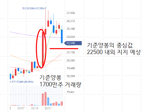 일봉상 장기 하락 추세를 돌파한 상태이며, 최근 2/19일 1700만 주의 대량거래가 발생하면서 장대양봉을 만들었습니다. 평소 거래량 70~100만 주 대비 17배 이상 터졌는데 바닥 탈출, 턴어라운드의 강력한 시그널로 볼 수 있습니다. 장대양봉의 중심 값인 22500원 내외를 지지한다면 다시 상승 시도가 나올 것으로 보이며, 3월 말 공매도 재개시 숏커버 가능성이 높은 종목이라고 생각됩니다.