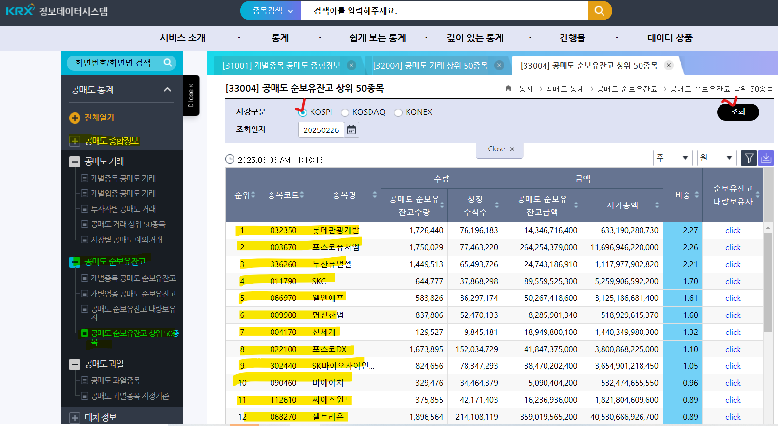 공매도 종합정보항목에서 공매도순보유잔고 -> 공매도 순보유잔고 상위 50 종목을 클릭하고 자신이 보고 싶은 시장을 클릭해서 순위를 보실 수 있습니다. 위 예시는 KOSPI 지수를 조회한 결과입니다.