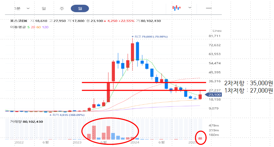 2023년 주가는 5천 원에서 대략 8만 원까지 16배 상승한 후 18,000원대까지 하락 후 바닥을 잡고 올해 1~2월 약 27,000원까지 50% 반등을 보인 후 현재 약 20% 조정받았습니다.
