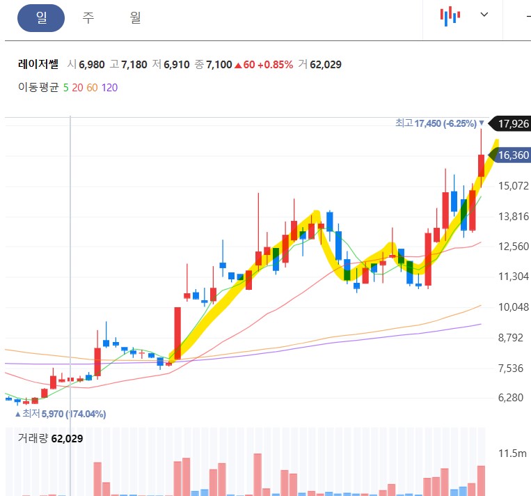 일봉 차트상 12,000원 18,000원 박스권의 중심값인 15,000원대 안착을 했다. 에코프로발 이슈로 이틀 전 급락을 했지만 바로 회복하는 모습니다. 거래량이 터져준다면 앞 전 윗꼬리 고점 18,420을 돌파하며 2만 원까지 상승할 것으로 예상한다. 현재의 박스권을 돌파하는 시점이 다음 주가 될 것으로 기대해 본다. 거래량이 터지면 생각보다 빨리 목표가에 도달 할 수 있을 것으로 본다.