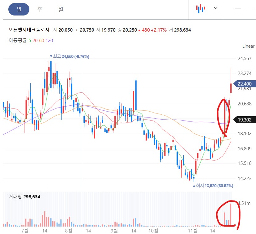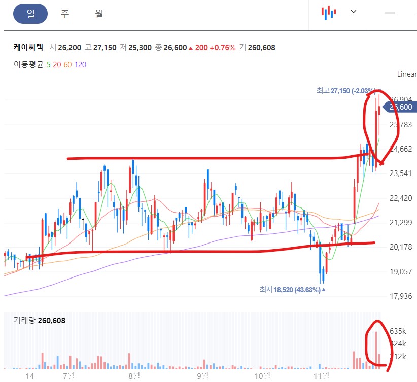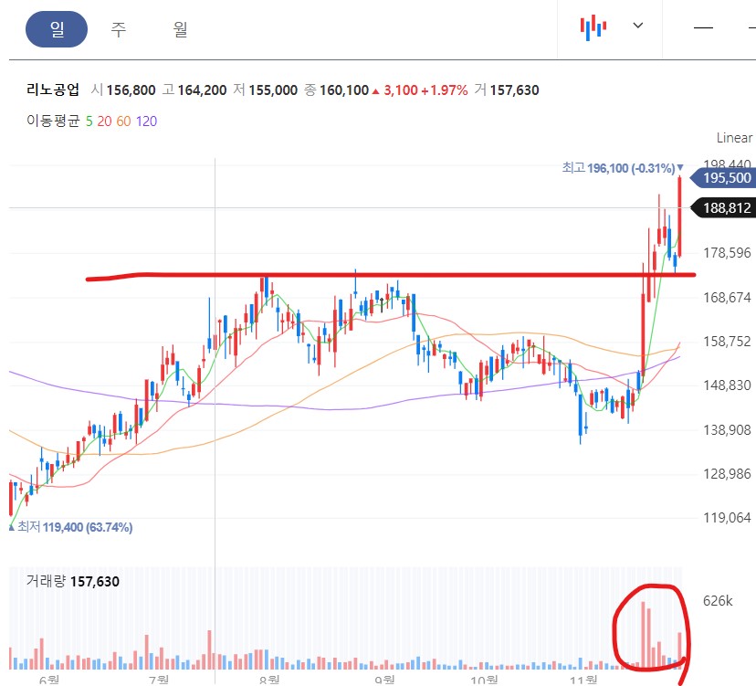 다시 돌아와서 어보브반도체를 살펴보자. 동사는 비메모리시스템반도체 기업으로 올해 반도체 종목들이 상승할 때 소외된 종목이었다. 최근 이렇게 소외된 바닥권 종목들에서 20일선 지지를 바탕으로 급등이 자주 나온다고 앞서 포스팅한 바 있다. (인포뱅크, 에이비엘바이오, 로보티즈, 태경비케이 등, 특히 태경비케이는 12/1일 중 흑연수출 통제 이슈가 있어 매수 관심 가질 만한다.) 어보브반도체는 거래량을 수반하는 장대양봉이 나왔어도 하락추세선을 돌파하지 못했고 위로는 120선 9200원대 저항과 하락추세선에 걸리는 10420원대 저항이 있어 연속적으로 거래량이 터져주지 않는 이상은 큰 추세 상승은 현재로서는 어려워 보인다.  단기 목표가 10400원 정도까지는 상승 여력이 있지만 약간의 시간 조정을 겪을 것으로 보인다(가격조정이 아니다). 하지만, 최근 이런 트렌드에서 급등이 나오고 있어 어보브반도체는 매도보다는 매수관심으로 봐야 할 종목이며, 시간 조정을 거쳐 60일선이 우상향 하게 되면 주가는 훨씬 탄력적으로 상승할 것으로 예측해 볼 수 있다.
