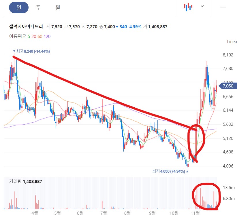 양봉은 시가보다 종가가 높은 것을 말하며 매수세가 강하다는 의미로 해석된다. 양봉 중에서도 가장 강한 양봉이 장대양봉인데 장대양봉은 몸통의 길이가 길어 종가까지도 매수세가 강했다는 의미를 내포한다. 시장이 좋을 때는 다음날 갭상을 할 때가 많이 나온다. 갭상승이란? 전날 종가보다 높게 시작하는 것을 말한다. 장대양봉이 나오게 되면 보통은 대량거래를 수반하는데 평소 거래량보다 10배 이상 터져준다면 추세 전환의 신호탄이 된다. 특히, 바닥권의 거래량증가 장대양봉은 강력한 추세전환을 의미하며 이때부터 주가에 관심을 가져야 한다. 특히, 하락 추세선을 돌파했다면 더욱 매수 관심이다. 하락추세선을 돌파한 장대양봉이 나온 갤러시아머니트리 종목과 아직은 하락 추세선을 돌파하지 못했지만 바닥에서 장대양봉이 출회된 어보브반도체의 추가 추이를 예측해 보자.