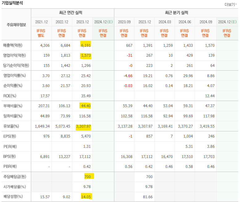 재무 상태를 보시면, 부채비율 44%, 유보율 3300%로 안정적인 재무를 가지고 있으며 배당 성향도 좋은 편입니다.