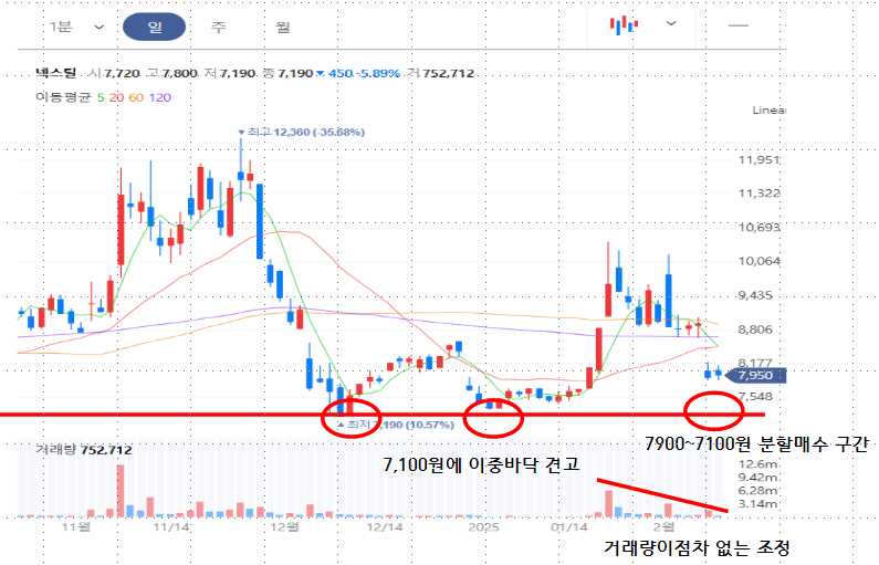 일봉 상 7,100원에서 이중 바닥을 만들고 상승했지만 이번 급락으로 바닥을 다시 확인할지 바로 반등이 이어질지 모르겠으나 7,900 ~7,100원은 분할 매수 구간이며 모아 가는 전략 유효하다고 생각합니다.