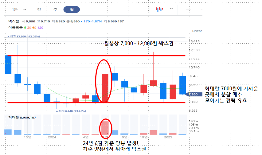 월봉상 24년 6월에 생성된 장대 양봉의 시가와 최고가 사이에서 박스권이 만들어진 것을 알 수 있습니다.