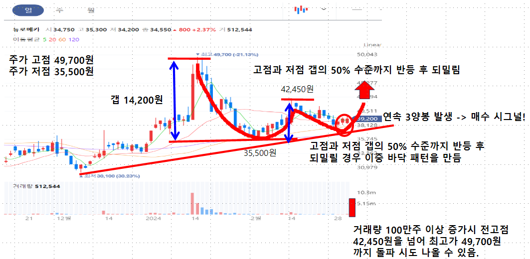 그리고, 이중바닥 패턴을 만들려는 초입에 매수세가 강함을 뜻하는 연속 3개의 양봉이 출회되었는데 여기서 거래량만 전고점 수준인 100만주 이상 증가해 준다면 전고점을 넘어 최고점인 49,700원까지 반등을 노려 볼 수 있습니다.