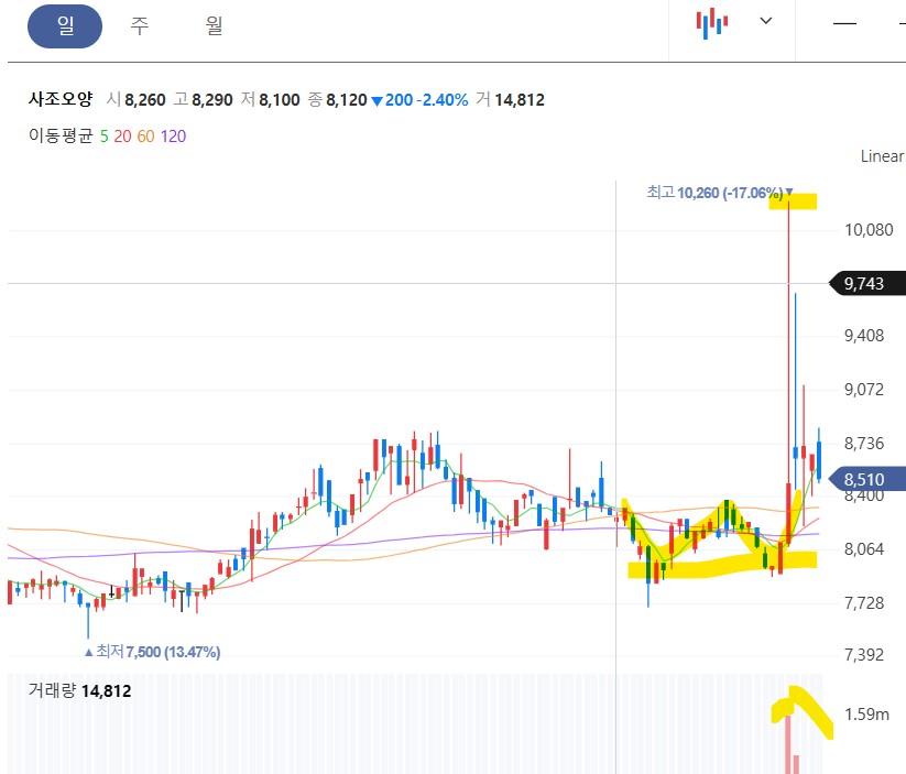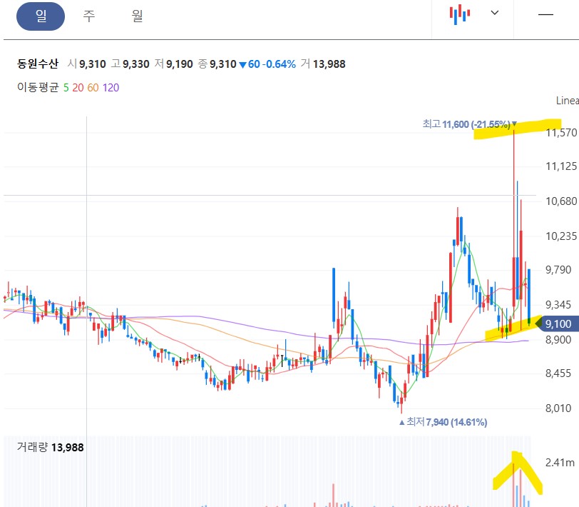 수산 중 중에서 현재 차트는 가장 예쁘다. 장기 이평선 120일선과 60일선을 깔고 있으며 20일선 주변에 주가가 위치해 있다. 최근 오염수 이슈로 거래량이 들어왔고 현재 눌림목 구간이다. 9000원 내외 매수 한다면 단기시세로 전고점 시도는 나올 듯해 보인다.