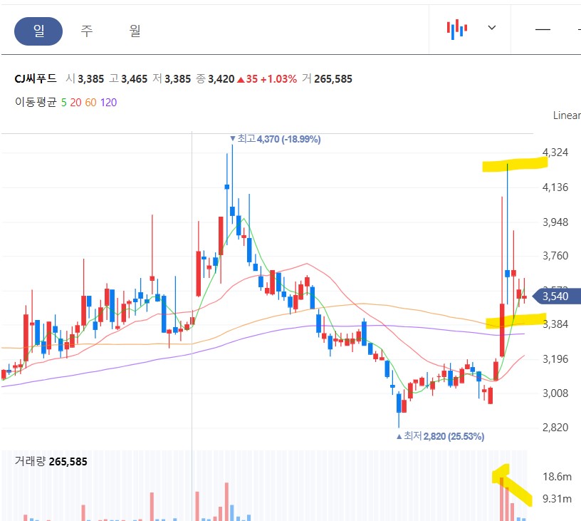 얼마 전 오염수 이슈로 거래량 증가와 함께 3000원대에서 4300원까지 약 40% 급등 뒤 현재 눌림목 구간이다. 20일선이 아직 60일선, 120선 아래에 있어 동원수산보다는 차트는 약하지만 반등 폭이 가장 컸다. 따라서 이번에도 가장 크게 반등 줄 지 기대는 가질만한다.