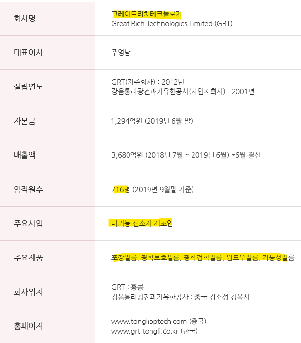 2019년 말 기준 매출액 3680억 원, 직원수 716명이며, 정밀 코팅 기능성 신소재 및 고분자 박막자재 개발, 생산, 판매를 영위하고 있는 중국자본의 회사입니다.