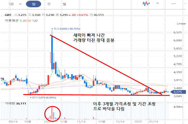 작년 10/21일 어떤 뉴스인지 거래량을 터뜨리면 장대음봉으로 세력이 빠져나간 흔적이 보입니다. 그 이후 약 3개월간 가격조정 및 기간을 조정을 끝내고 3천 원 대에서 바닥을 다지고 있습니다.