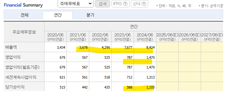 24년 기준 매출액을 8,424억 원을 기록했습니다. 영업이익 또한 지속 상승 추세를 유지하다가 23년 대비 24년 큰 폭의 증가를 보이고 있는 성장 기업임을 할 수 있습니다.