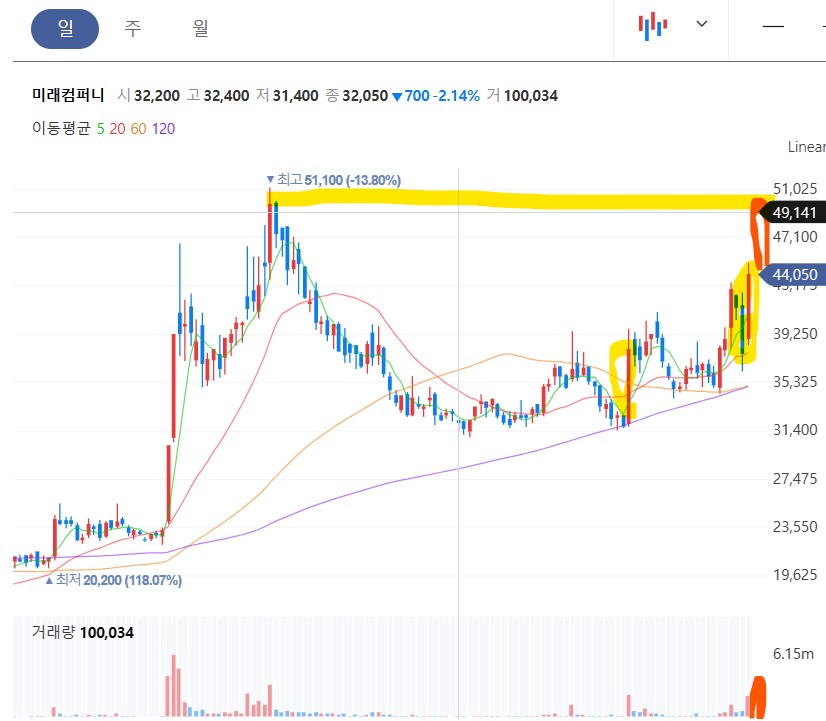 기술적 분석으로 장대음봉을 장악하는 장대양봉이 출회되면 강한 상승 흐름이 나온다. 장대음봉은 매수세력보다 매도세력이 많을 때 생기는 캔들로 하락의 기운이 강하다. 하지만 바로 다음 날 장대양봉이 나온다면 하락의 기운을 한 순간에 상승의 기운으로 제압한 것을 뜻하기 때문에 이후 주가는 대체로 상승하는 경우가 많다. 전고점 51000원까지 돌파 시도가 예상되며 눌림목을 줄 때 매수 타이밍을 잡아보면 좋을 듯하다. 참고로, 장대음봉 장대양봉이 캔들 패턴이 나온 섹터는 신성이엔지, 엠케이전자, 하나마이크론 등 반도체 종목에서 많이 출회되었다.