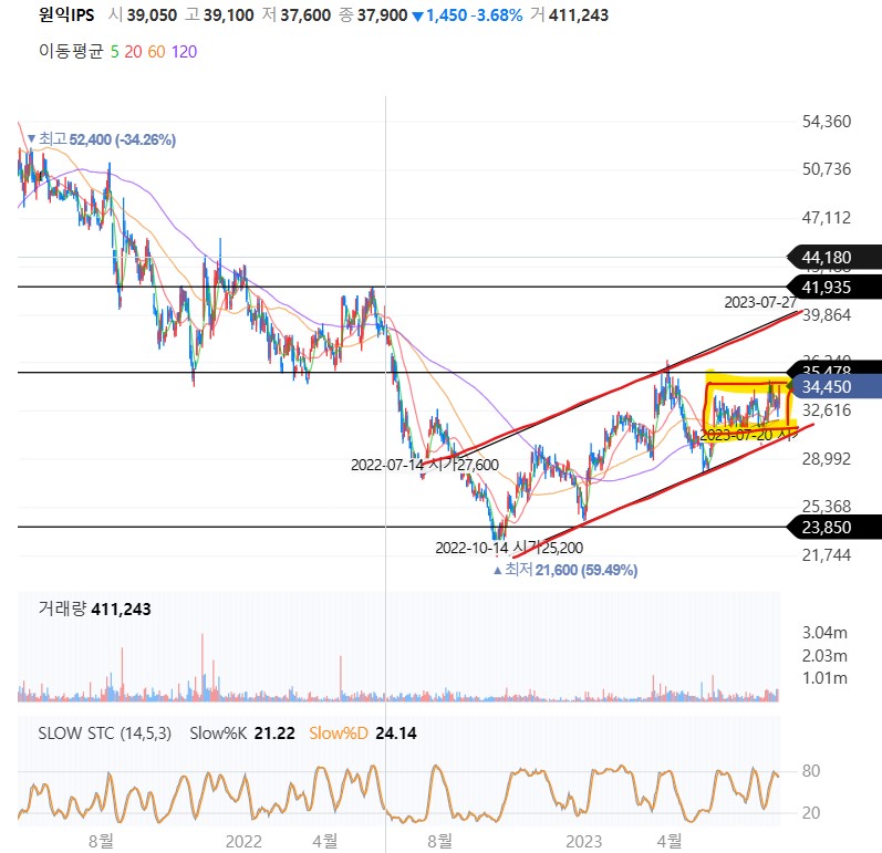 일봉 차트를 보면 2달간 답답한 횡보를 이어가고 있다. 개미 주주들이 지긋지긋해하는 구간까지 와있다. 반도체 장비주들이 전부 급등하는데 동사의 주가는 거북이다.