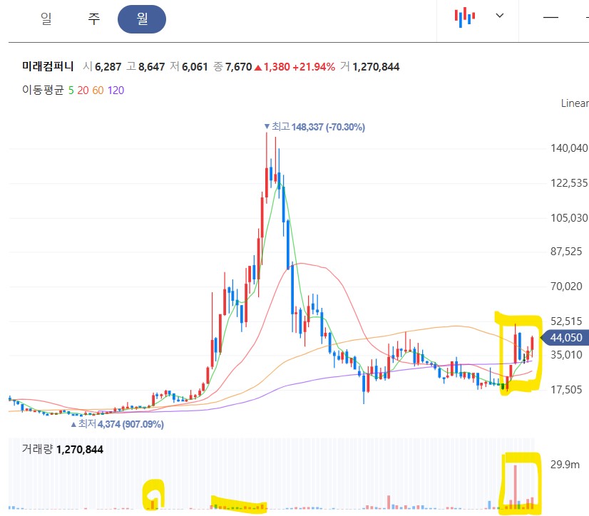 미래컴퍼니의 기술적 분석을 짚어 보자. 6월 26일 거래량 증가의 장대양봉이 나온 이후 한 달 동안 주가는 등락 혼조를 보이며 5일선, 20일선, 60일선, 120선 정배열를 만들어 놓고 어제 앞의 장대음봉을 장악하는 거래량 증가의 17%짜리 장대양봉이 출회되면서 대세 상승의 신호를 알렸다.