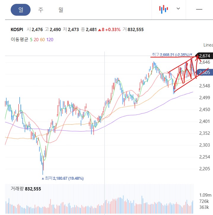 코스피 지수 역시 2500~2660p 박스권에서 작은 상승 추세를 만들고 있다. 환율이 상승하면 지수가 하락하고 환율이 하락하면 지수가 상승한다. 외국인들은 환율에 의해 국내 시장 수급을 조정한다. 올해 외국인들이 현물을 10조 이상 매수 하고 있어서 당장 시장을 떠날 염려는 없어 보인다. 다만. 최근 현물에서 일부 매도를 하면서 선물로 1 조이상 매수 매도를 반복하고 있다. 파생시장인 선물과 풋옵션에서 단기 하방포를 구축하여 차익 실현한 것으로 보인다. 팔았던 현물을 다시 사들이면서 지수 상승에 베팅 할 것 같다. 선물을 1조 이상 사들이는지 지켜보자. 선물은 미래의 약정된 만기 일에 지수가 상승해 있을 것인지 하락해 있을 것인지를 알 수 있는 지표 이기 때문에 선물은 선행지표 현물 지수는 후행지표다. 그래서 코스피 지수를 보는 것보다는 선물 지수로 시장을 파악하는 것이 더 정확하다. 상품시장에서 곡물가 등을 선물로 보는 것도 그런 이유에서다. 코스피 지수가 전고점 2668p를 돌파하기 위해선 환율은 1270원 이하로 떨어져야 하고 외국인들이 현, 선물 동시에 매수해야 한다. 그렇지 않을 경우에 저항에서 매도 지지에서 매수하는 박스권 전략에 익숙해져야 한다. 이해가 잘 안가면 삼성전자만 보자. 삼성전자가 73600원을 돌파하면 코스피가 전고점을 돌파하는 거다. 삼성전자가 68000원~73000원 박스권이 언제 돌파되는지 체크하자. 시간이 걸릴 뿐 올해 안에 삼성전자가 박스권을 돌파하는 날이 올 것으로 기대한다.