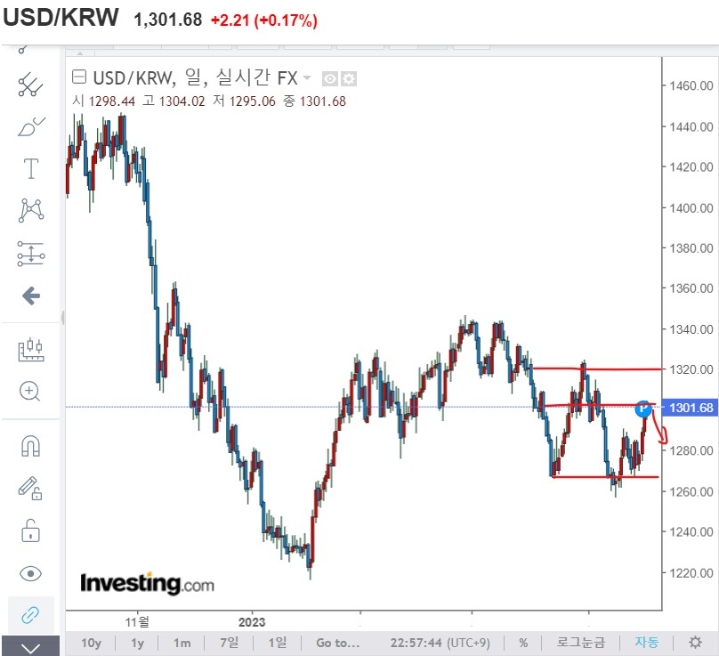 한 가지 더! 환율을 잘 체크하자. 환율은 1270원 내외 ~ 1300원 내외 수준에서 박스권을 형성하고 있다.