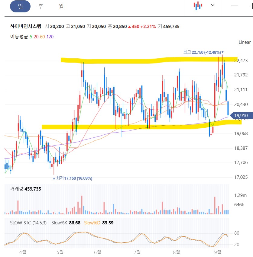 중국발 악재 기사로 하이비전시스템을 싸게 살 수 있는 기회라고 생각한다. 차트는 박스권 하단까지 밀려 내려온 상태다.
