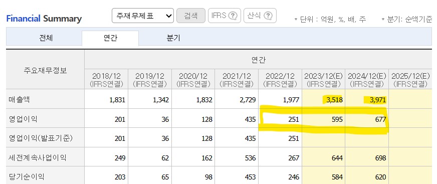 실적을 보면 올해 전년대비 2배 이상의 영업이익이 예상된다. 2024년까지 매출액 약 4000억 원과 영업이익 677억 원의 실적 성장이 기대되는 종목으로 현재 시가총액 2975억 원은 너무 싸다