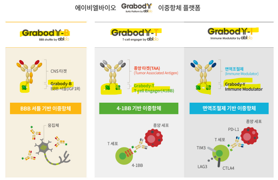 출처:에이비엘바이오 홈페이지 , Grabody-B,T의 파이프라인이 많음