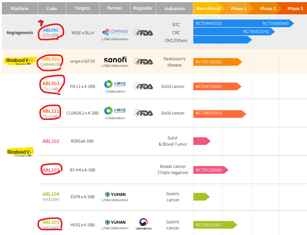 이 신약은 주요 면역항암제 후보 물질로, PD-L1과 VEGF를 동시에 억제하는 이중항체 치료제입니다. PD-L1은 암세포가 면역 시스템의 공격을 회피하는 데 중요한 역할을 하며, VEGF는 종양 성장에 필수적인 혈관 신생에 관여하는데 이 두 경로를 동시에 억제함으로써 암세포의 성장을 억제하고, 종양에 대한 면역 반응을 강화시키는 기전으로 설계되었습니다. 또한, 가장 앞선 글로벌 임상 파이프라인으로 미국 컴패스 테라퓨틱스에 기술 이전하여 글로벌 임상 중이며 DLL4 * VEGF를 타깃한 이중항체로 담도암 임상 2/3상, 대장암 임상 2상을 진행 중입니다. 담도암은 발병률은 낮지만 2차 치료제로 쓸 대안이없어 5년 생존율이 20% 이하라고 하는데 이 신약은 임상 2상 중간 결과에서 긍정적인 결과를 보였고 내년 임상 결과를 본 후 바로 신약 신청을 할 가능성이 높다고 합니다.