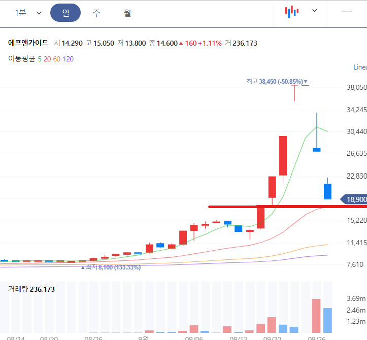 동사의 주가는 지난 금요일 하한가를 맞았는데요~ 월요일 갭하락 시작 시 대략 17,000원 내외에서 3분할로 단타 접근한다면 짧은 단타 수익을 낼 수 있어 보입니다. 급등 테마 대장주가 최고점에서 50% 단기 급락 시에는 기술적 반등이라도 나와주기 때문입니다.
