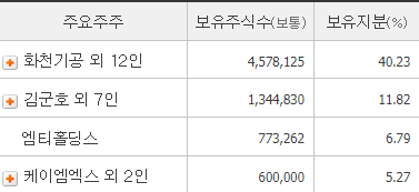 동사의 주요 주주는 화천기공, 화천기계로 조국 테마주로 정치테마주의 단골 종목이기도 합니다.