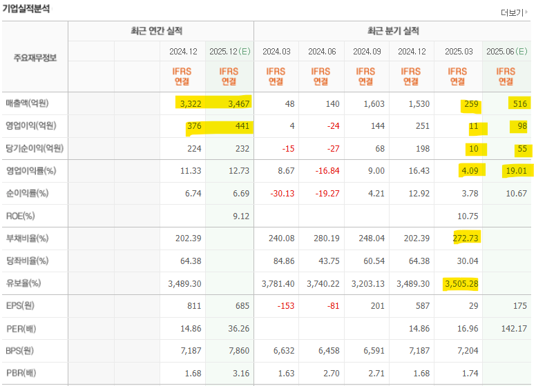 현재 시가총액: 8,388억원 , 매출액: 259억원 (전년동기 대비 +438.4%), 영업이익: 11억원 (전년동기 대비 +154.4%), 순이익: 10억원 (전년동기 대비 흑자전환) 2분기 매출액, 영업이익 예상치는 1분기 대비 매출액은 2배 영업이익 9배 상승이 예상됩니다.