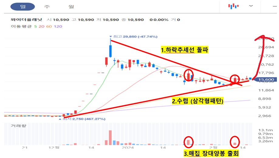 기술적으로 본다는 지난 12월 7연상 뒤 29,850원 고점을 찍은 뒤 50% 이상 하락하며 중간중간 세력의 매집이 들어온 것으로 보이는 장대양봉이 출회되었습니다. 기술적으로 삼각형패터의 수렴구간을 만들었으며 하락추세를 돌파한 상태입니다. 차트를 이렇게 예쁘게 만들어 놓고 주말에 윤대통령과 사진찍기? 이러는 거 아니지 않습니까? ^^