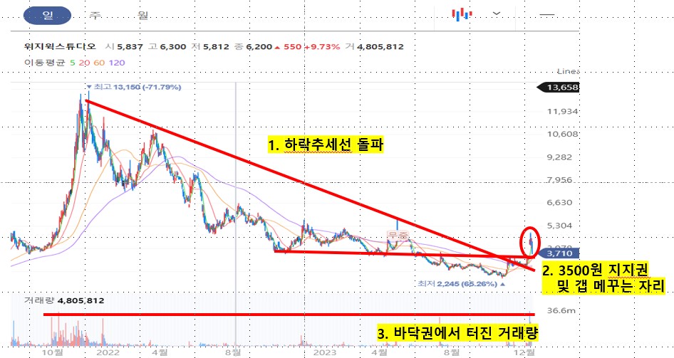 미디어 관련주가들은 2023년 내내 주가가 하락을 하면서 대부분의 주식들이 바닥권에서 이제 12월 성수기를 앞두고 주가가 반등을 보이고 있습니다. 최근 CJ E&M, 이노션 등의 주식은 내년에 대한 기대감으로 바닥권에서 하락추세를 돌파하고 있으며, 위지웍스튜디오 역시 같은 미디어 업종으로 추가 상승이 기대되는 이유입니다.