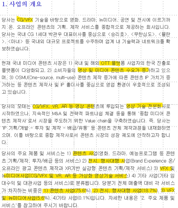 두 번째 이유는 애플 혼합현실 헤드셋 출시 관련 뉴스 및 삼성디스플레이의 삼성 차세대 신제품 XR 헤드셋을 겨냥한 것으로 추정되는 '플렉스 매직'의 출원뉴스가 있었습니다. 위지웍스튜디오의 사업 내용을 보면 CG/VFX, VR, AR 등 가상 영상기술서비스를 영위하고 있어 메타버스 관련 재료에도 연관이 있어 보이네요.