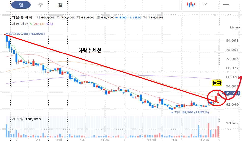 둘째, 하락추세를 돌파했는지 확인한다. 하락추세 저항선은 두 개의 고점과 고점을 선으로 그어 보면 만들 수가 있습니다.