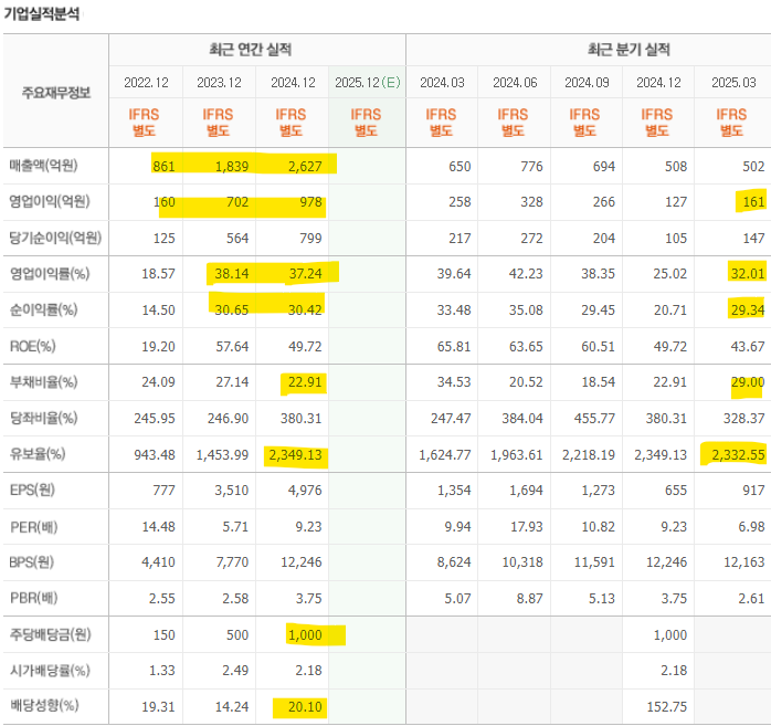 최근 3년간 30~40% 이상의 매출액, 영업이익이 큰 폭 성장하였고, 영업이익률은 37% 수준입니다. 이러한 성과는 고마진 제품 비중 확대와 원가 부담 완화가 주요 요인으로 작용했고 특히, 미국 내 전력망 노후화와 교체 수요 증가로 인해 수출 호조가 이어지며 영업이익률과 순이익률 상승에 기여했습니다.