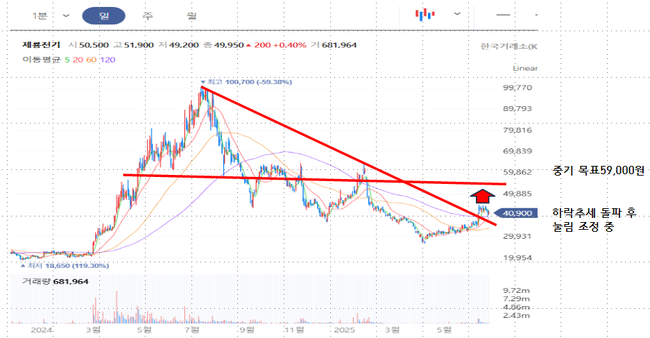 동사의 주가는 24년 7월 10만원 최고가를 찍은 후 현재 4만원대 가격 조정을 심하게 받은 상태입니다. AI전력 수급난에 따른 원전 주의 급등과 HD현대 일렉, LS일렉, 효성중공업의 3대 대형주 전력 주도주가 고가권에서 신고가를 트라이하고 있습니다. 이에 순환매로 중소형주 전력주 동사의 상승을 예상해 봅니다.
