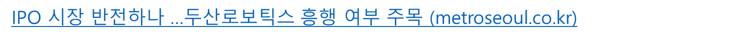 두산로보틱스는의 일반 청약은 9월 21~22일 진행예정이다. 대략 1~2조 원대로 상장될 것으로 전망되는데 현재 삼성이 인수한 로봇 대장주 레인보우로보틱스 시가총액이 2조 700억 원대로 두산로보틱스 상장 시 상승 여력이 꽤 있어 보인다. 동사는 협동로봇에 이은 새 먹거리로 자유주행로봇(AMR) 개발에도 주력하고 있는데 두산로보틱스의 상장뉴스로 자율주행 종목들을 살펴볼 필요가 있다. 에이테크솔루션, 인포뱅크, 퓨런티어, 유니퀘스트, 모토렉스 등 자율주행 관련 종목들으 차트 위치가 바닥이다. 한화도 후발로 오는 10월 한화로보틱스를 상장시켜 로봇사업을 본격화한다고 한다. 시장은 삼성로봇, 현대로봇, 두산로봇, 한화로봇의 4파전 구도가 전개되는 양상이다. 향후 로봇주들은 다시 시장을 주도할 수 있어 봐야 할 섹터다. 현대는 에스피지, 에스피시스템즈, 해성티피씨 등 M&A를 아직 추진 중에 있다. 로봇주가 기대되는 이유다.