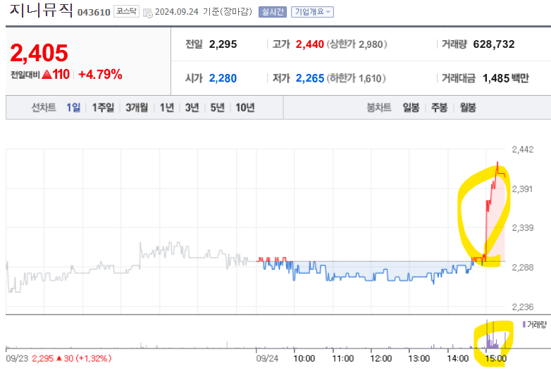 15시 종가 무렵 동사의 일봉차트에 갑자기 수상한 수급이 들어오기 시작했습니다.