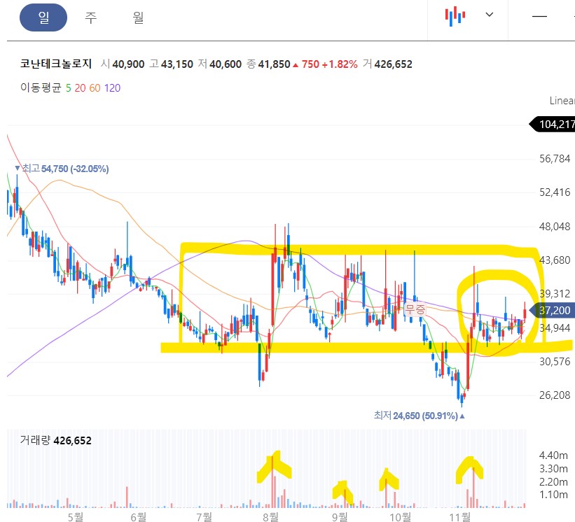 현 구간 차트가 밀집되어 있는 것을 볼 수 있습니다. 한 번의 대량거래량만 수반된다면 45000원 이상 전고점 박스 상단까지 상승할 수 있는 모양새를 갖췄다고 볼 수 있습니다. 군데군데 매집의 기운도 느껴지고요!