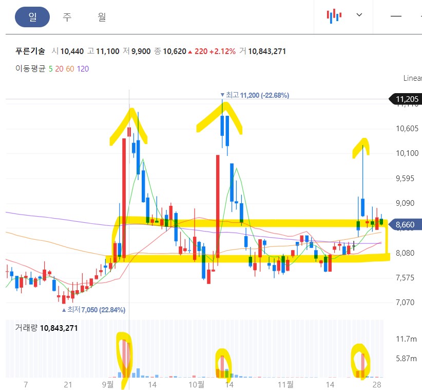 9월부터 11월까지 3차례에 걸쳐 급등 급락을 반복하면서 모든 이평선들이 정배열 초입구간으로 모여 있습니다. 작정하고 매집한 것 같이 보이는데 로봇이슈, 정부의 지하화 뉴스 등 재료도 좋습니다. 하지만 참고만~