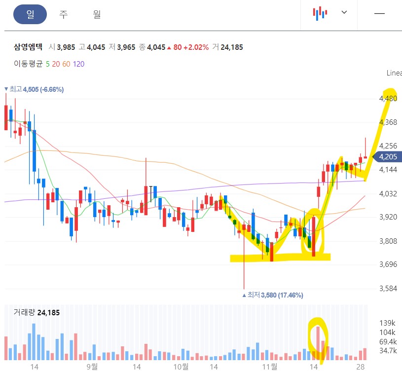 9월부터 11월까지 3차례에 걸쳐 급등 급락을 반복하면서 모든 이평선들이 정배열 초입구간으로 모여 있습니다. 작정하고 매집한 것 같이 보이는데 로봇이슈, 정부의 지하화 뉴스 등 재료도 좋습니다. 하지만 참고만~