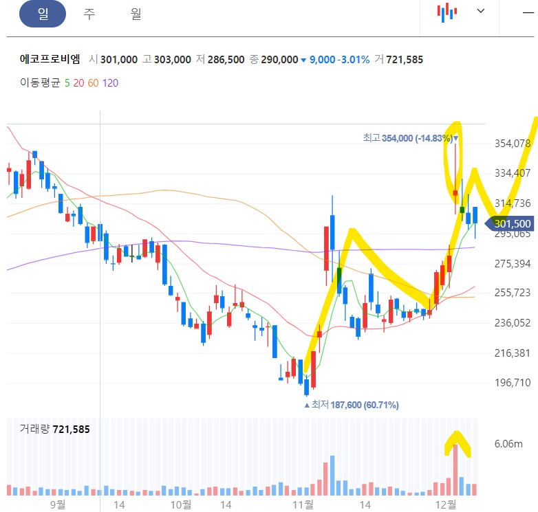 에코프로비엠에 4일 전 들어온 엄청난 수급은 형님 나갑니다요를 뜻하는 수급이며 그때 생긴 갭은 어느 정도 메꿔졌다고 볼 수 있습니다. 30만 원 정도면 매수 가능 구간이며 다음 반등은 40만 원을 예상합니다. 예전 처점 일자백으로 상승하기보다는 그림과 같이 계단식의 상승이 예상되니 만약 당일 기준 급등한다면 한번 팔아주면서 다시 재매수하는 매매 전략을 구사하는 것이 수익률이 있어 유리합니다.