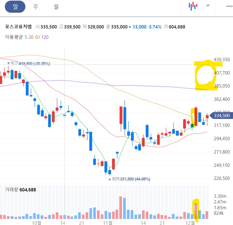 포스코퓨처엠 또한 마찬가지로 금일 코스닥 반등을 주도할 것으로 보이며 38만 원~42만 원 사이에서 일부 매도 후 다시 재매수하는 전략으로 매매하면 좋을 것 같습니다.