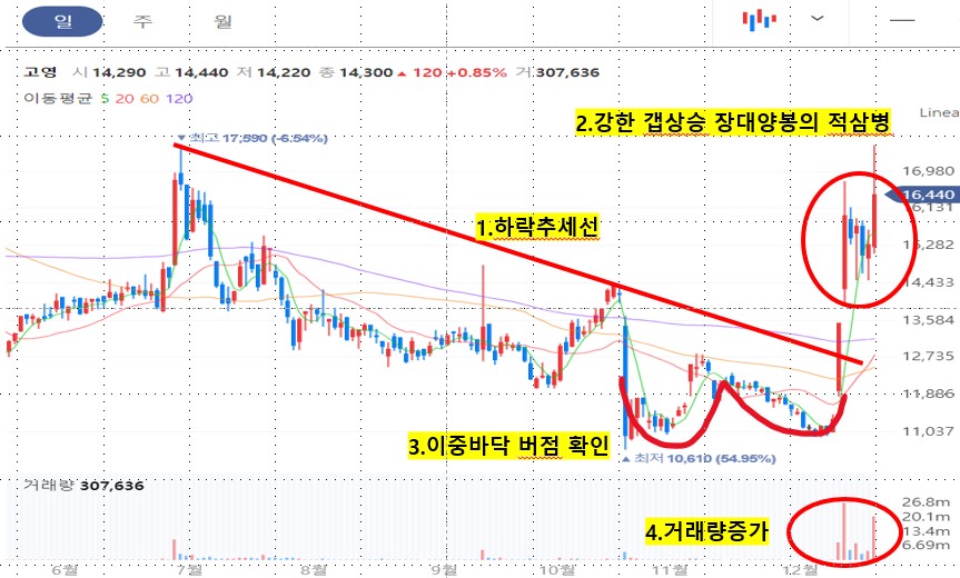 10,000원대에서 이중 바닥을 만들고 하락 추세선을 돌파하는 강한 갭상승의 긴 장대양봉으로 적삼병을 만들어서 파멥신과 같이 강한 힘을 느낄 수 있는 종목입니다. 금일도 눌림을 주고 7% 재상승을 했는데 거래량이 증가 하고 있어서 추가 상승이 예상됩니다.