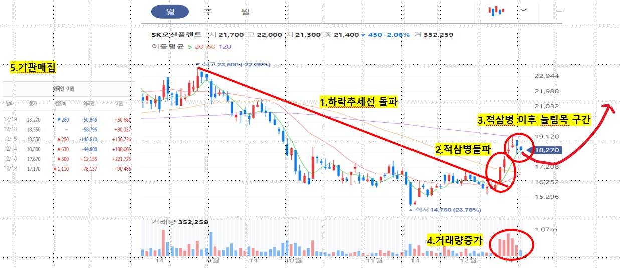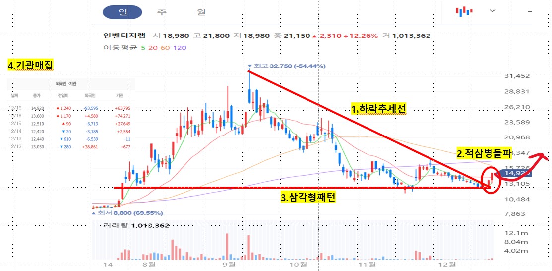 동사의 주가는 올 초 8,000원에서 32,000원까지 4배 급등한 후 하락 5파로 빠졌는데 최근 12,000원대에서 하락 지지를 만들고 적삼병으로 하락추세선을 돌파한 상태입니다. 또한, 삼각형 패턴을 만들면서 돌파를 한 것이 특징이며 기관의 최근 매집이 예사롭지 않아 보입니다.