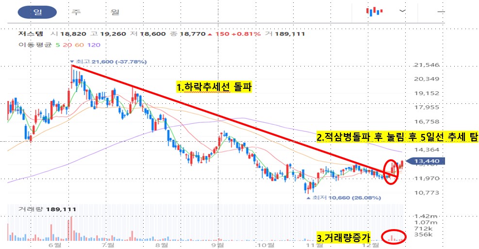 동사의 주가 역시 적삼병패턴을 만들고 눌림목 구간입니다. 동사 역시 최근 핫한 반도체 장비주에 속하는데 추가 상승을 기대해 봅니다.