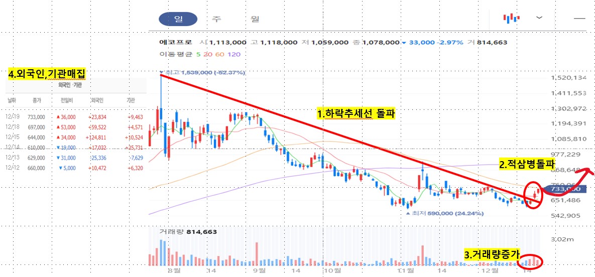 마지막으로 오늘 적삼병을 완성한 개인투자자들이 가장 선호하는 2차 전지 대장주 에코프로입니다. 오늘 중 정부의 양도세 완화 정책이 발표될 것으로 보이는데요. 대주주 회피 물량이 철회되면서 오히려 주식을 더 매수하는 효과가 나올 것으로 기대가 됩니다.