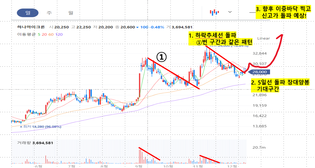 하나마이크론 역시 하락추세선을 돌파 시도 후 현재 눌림목 구간입니다. 1번 구간가 같은 패턴으로 전개될 확률이 높아 보입니다. 눌리면 당연 매수겠죠? 크게 본다면 신고가 돌파도 예상되니 참고하면 좋겠습니다.