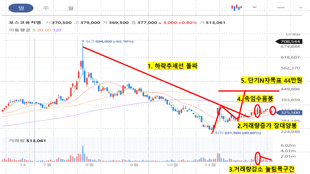 포스코퓨처엠은 사진과 같이 하락추세선을 돌파한 가운데 7 거래일 전 발생한 거래량증가 장대양봉이 기준이 되어 현재 거래량 없이 눌림목 구간입니다. 어제의 음봉은 속임수 음봉으로 매수 음봉이라고 볼 수 있겠죠? 오늘이라도 거래량이 증가되면서 120일선 저항을 돌파라는 장대양봉이 나온다면 단기 엔자 목표 44만 원까지 볼 수 있습니다. 만약 오늘 음봉을 준다면 더 매수해도 됩니다. 이 외에 에코프로비엠, 엘앤에프 등 2차 전지 대장주들의 추가 상승이 기대되는 시점입니다.